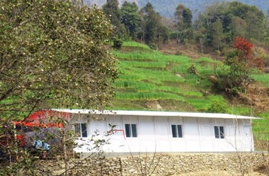 The prefabricated classrooms have finally been transported to the school after months of fuel shortages making it impossible for the trucks to travel to the village from Kathmandu. The base for the classrooms was constructed with help from the villagers and tradesmen from Kathmandu erected the framework, walls and roof with assistance from villagers - fantastic teamwork.